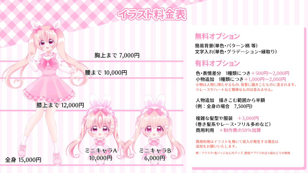 SNSアイコン、YouTubeサムネイル、ゲーム立ち絵、グッズ用ミニキャラなど、