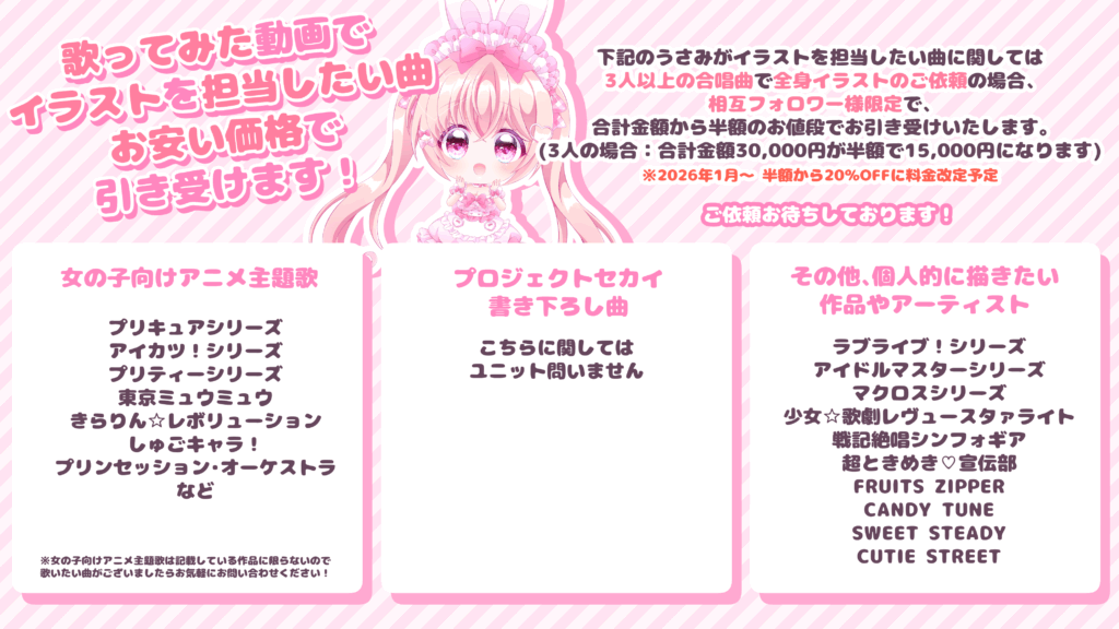 このたび、制作環境の整備および品質向上を目的として、2026年1月よりイラスト制作の料金を改定させていただくこととなりました。